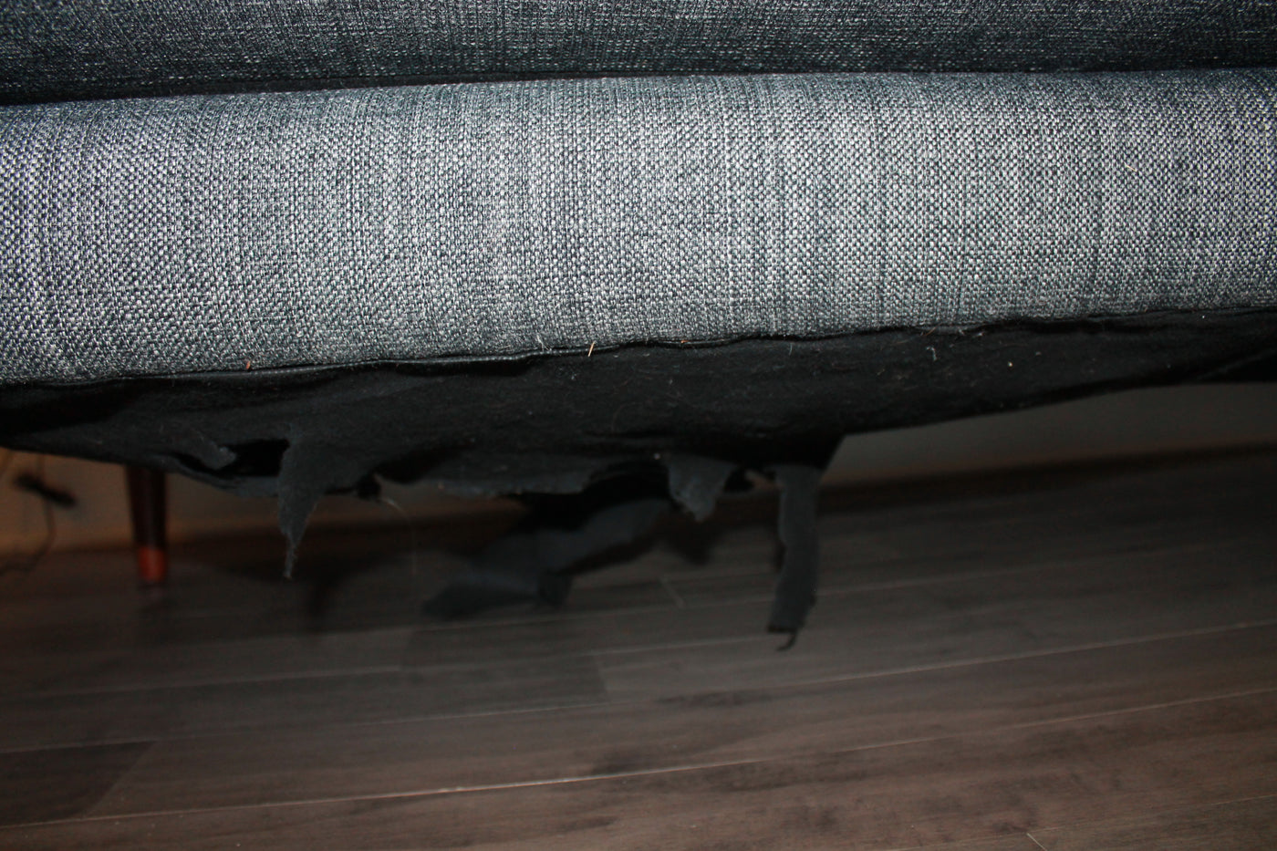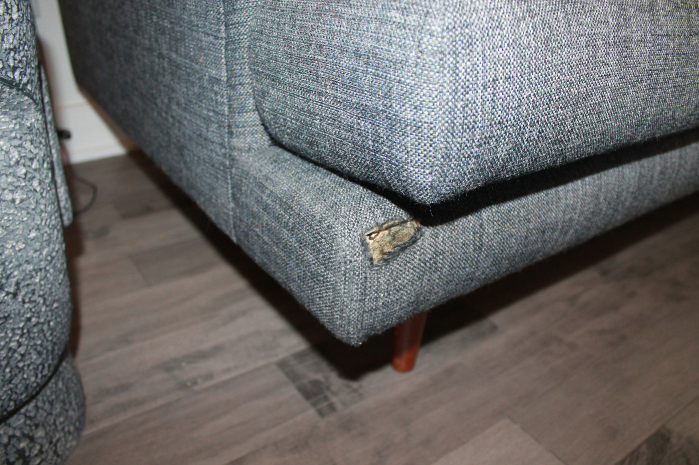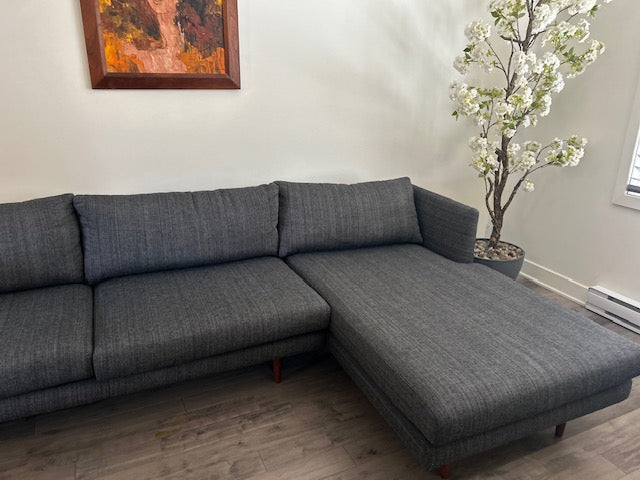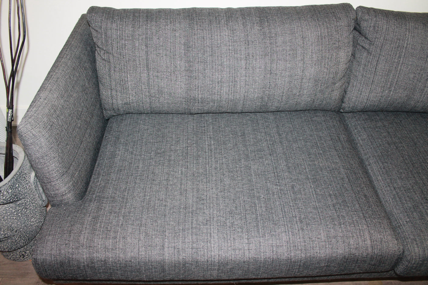Velcro seats with loose back cushions, mid-century styling, some damage to fabric under seating as shown. 70x34" main section, 36x64" extension.