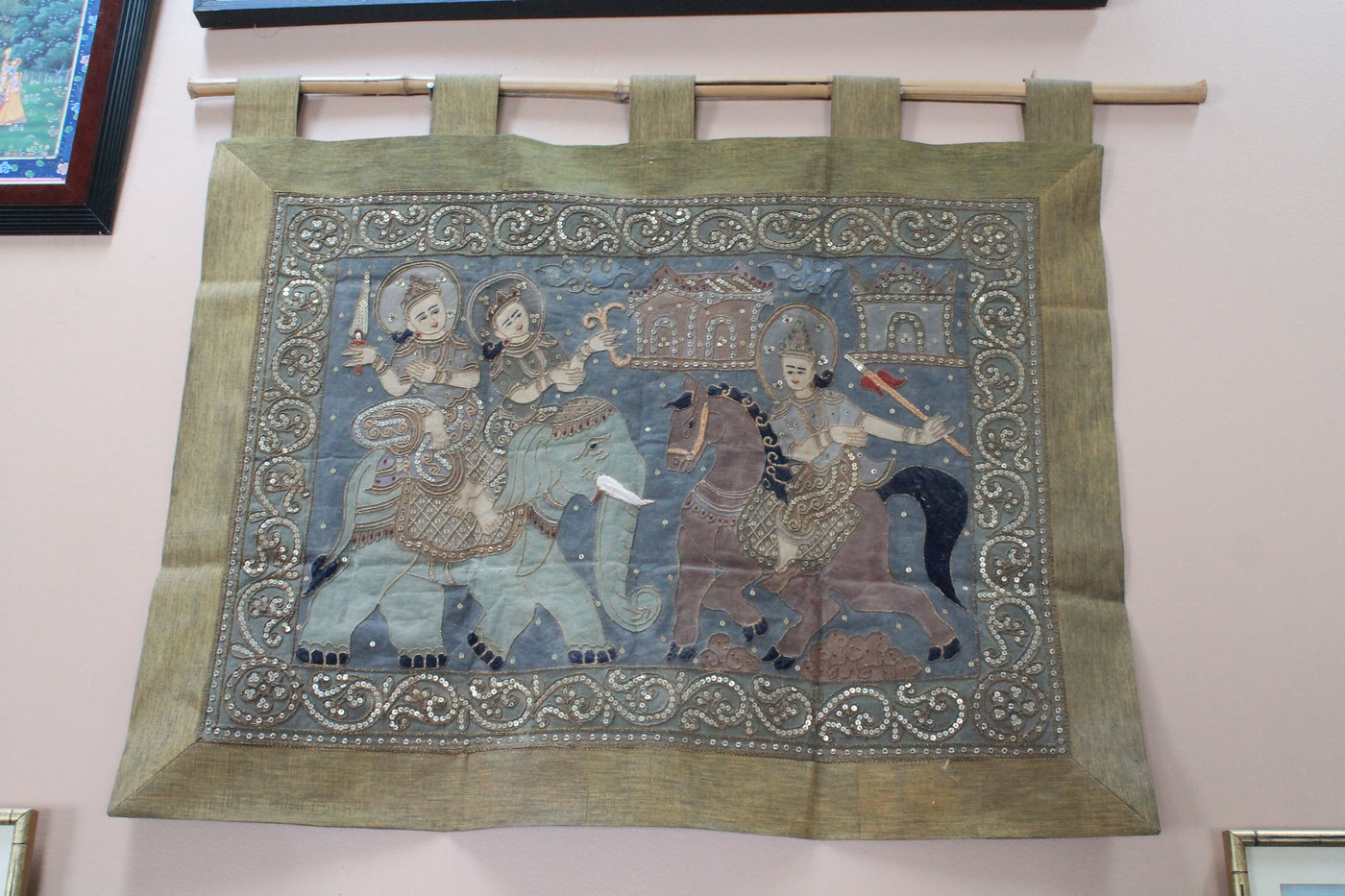Heavy hanging tapestry of Burmese or Thai origin. App 30" square.
